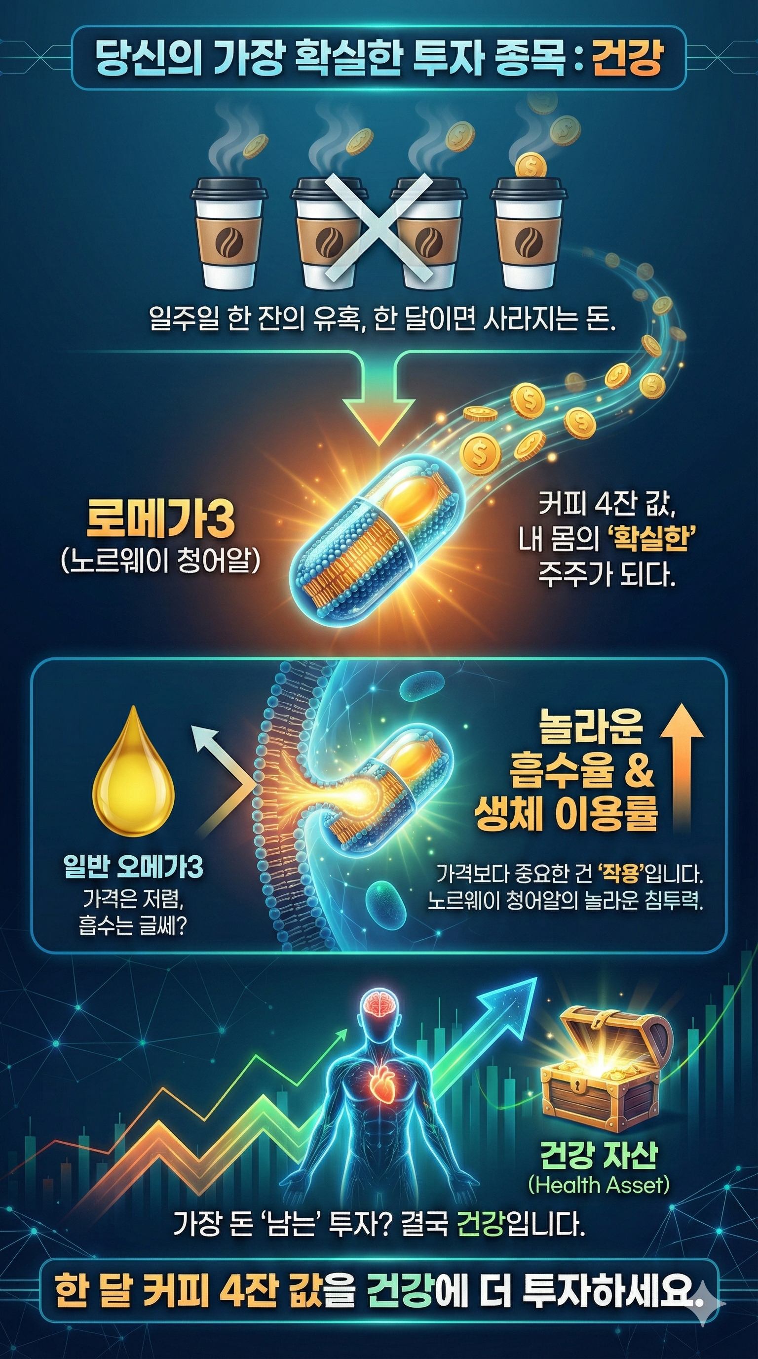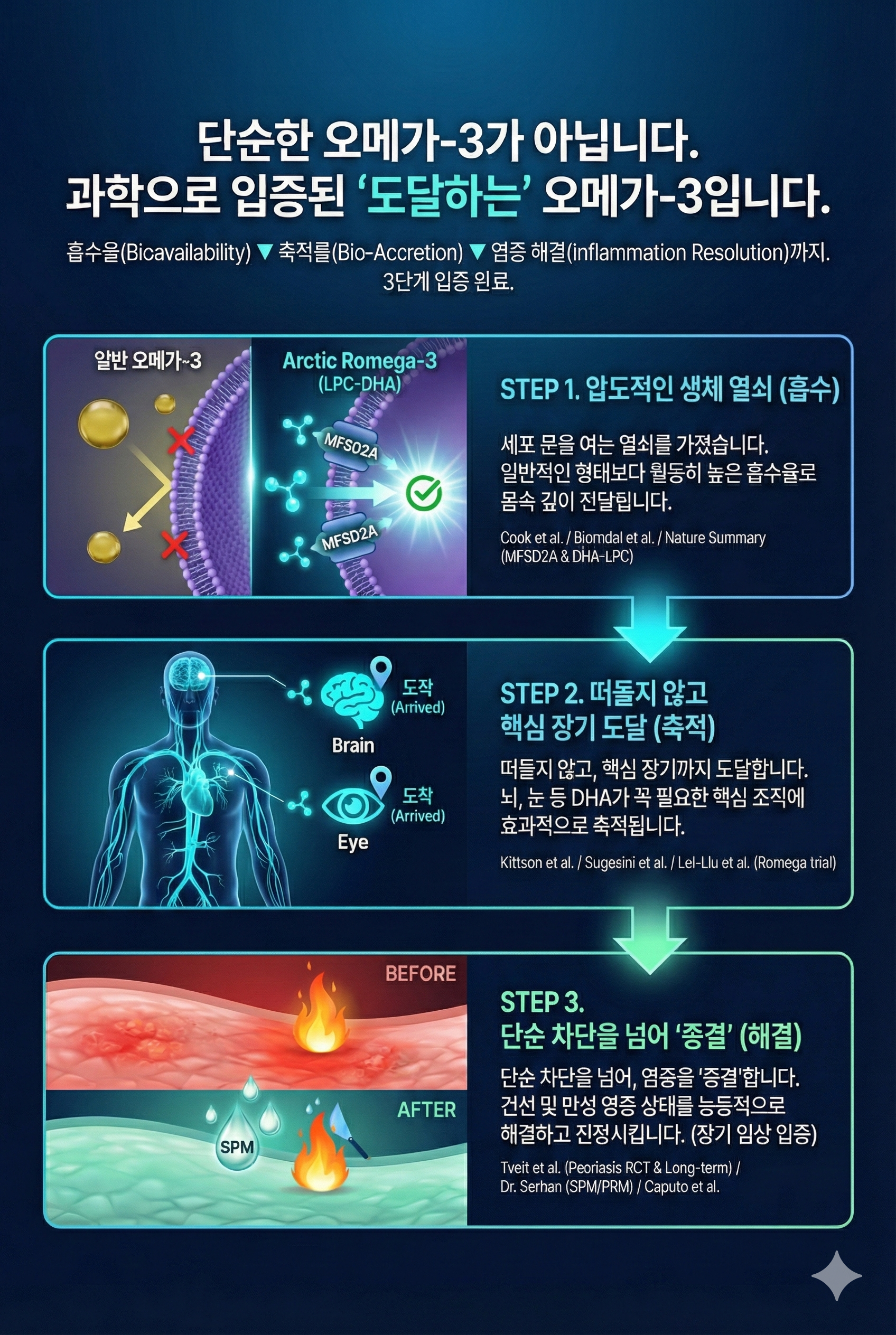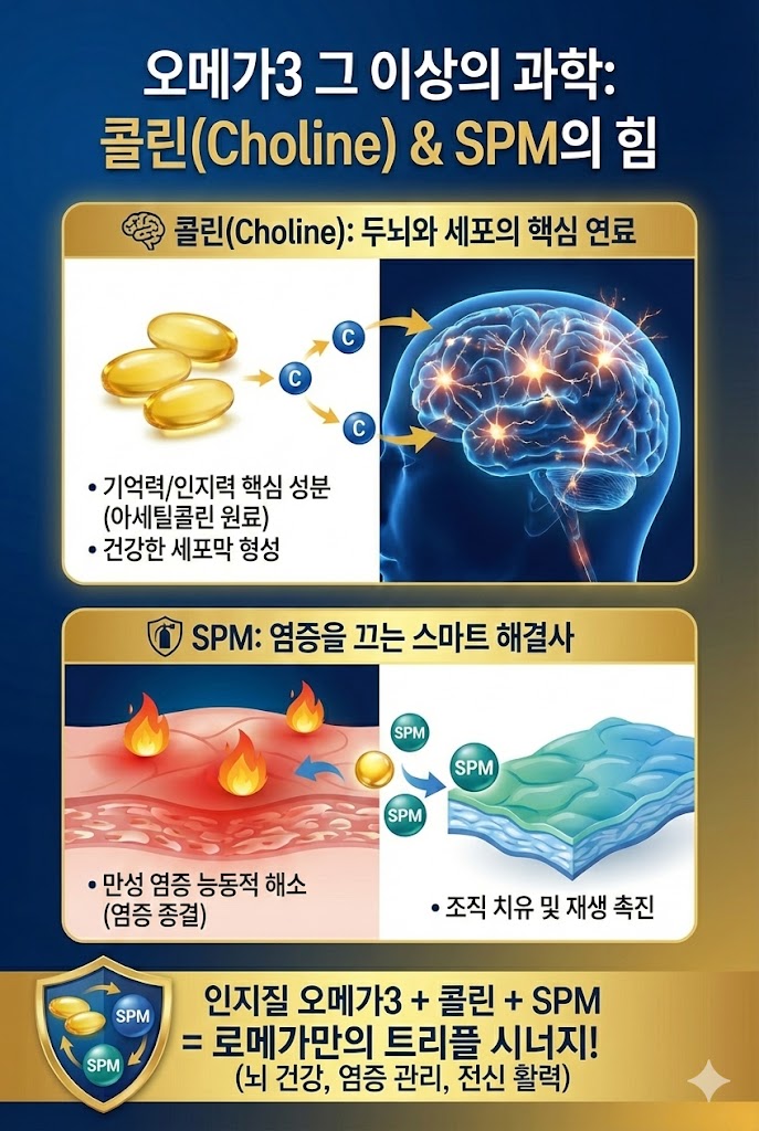 로메가는 오메가-3 지방산이 세포막과 유사하 인지질(Phospholipids) 형태로 결합되어 기존 존 트리글리세라이드 형태(Triglyceride form) 오메가-3 대비 높은 생체 이용률을 보이며, 또한 기존 오메가 3에는 없는 콜린 및 SPM함유로 염증 완화 및 다차원적 영양케어 가능합니다.