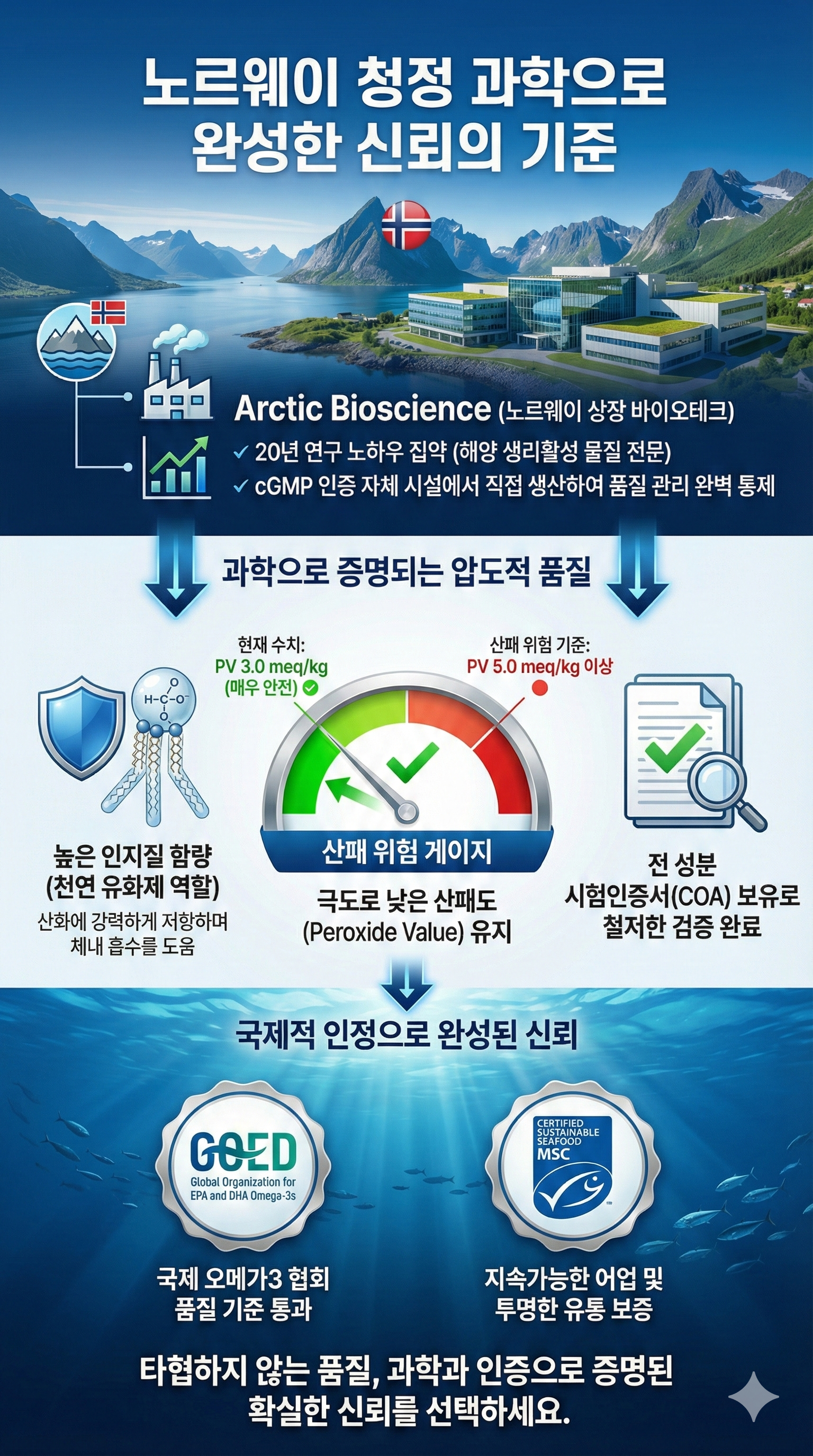 모든 제품은 엄격한 품질 관리 기준에 따라 철저한 테스트를 거치며, 이를 통해 고품질·고순도의 프리미엄 제품만을 제공하며. 또한 GOED 회원사로서 오메가-3 제품 순도에 관한 그들의 엄격한 기준을 준수하고, cGMP 생산시설에서 제품 생산