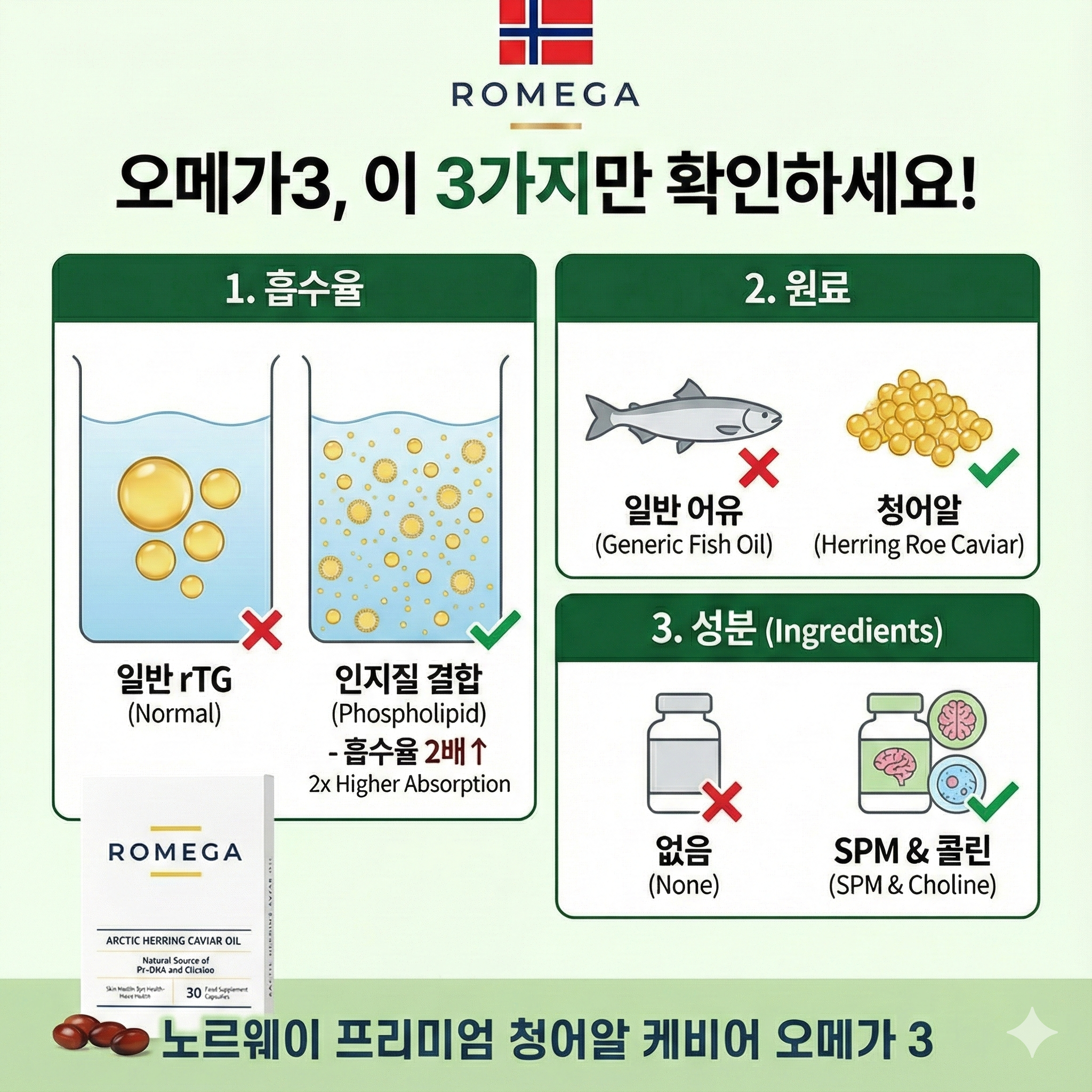 Romega® Arctic Caviar Oil 은 고용량 청어알 캐비 오일 제품으로 심장, 눈, 머리에 좋은 종합 오메가3제품이고 Romega® SKIN REFINE는 청어알 케비어 오일에 피부탄력 및 주름 개선에 효과 있는 원료인 리포위트 + 해양 콜라겐 + 비타민C+비오틴을 추가한 이너 뷰티 제품입니다.